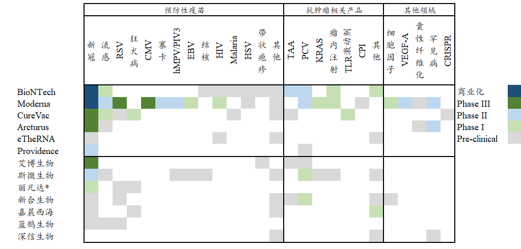 图5 mRNA国内外部分代表性企业管线布局信息(全球最高研发阶段)*丽凡达生物被艾美疫苗收购,此处借鉴艾美疫苗管线信息