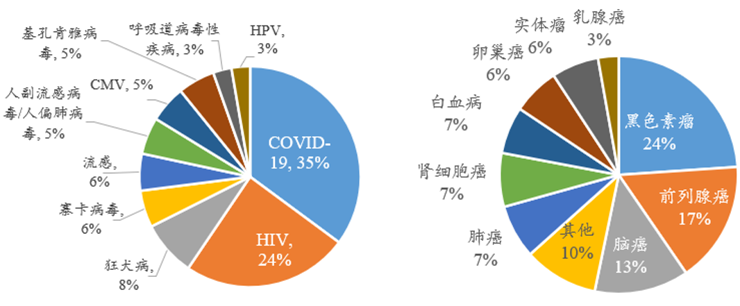 图6. 感染性疾病(左)和肿瘤领域(右)拟开发适应症分布[8]