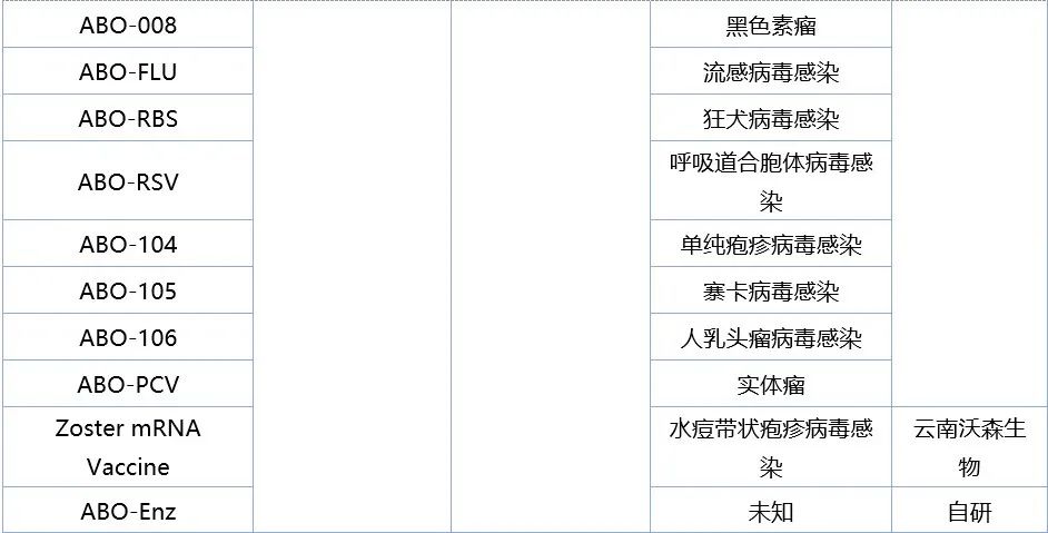 蓝鹊生物于2019年在上海成立,专注于mRNA药物创新研究,还可为mRNA研发和生产提供CRO和CDMO服务。目前蓝鹊生物与外部合作的产品管线主要集中在传染病预防领域,包括新冠疫苗、RSV疫苗和流感疫苗,均处于临床前阶段。
