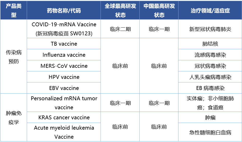 斯微生物在2016年成立于上海,作为国内另一代表性的RNA技术企业,致力于打造成中国领先的mRNA药物平台和产品管线。斯微生物的管线聚焦于预防性疫苗和抗肿瘤领域,根据官网管线和临床申报数据,斯微生物目前有一款新冠疫苗产品处于临床二期,一款PCV产品处于临床一期,其余管线品种均在临床前研发阶段。
