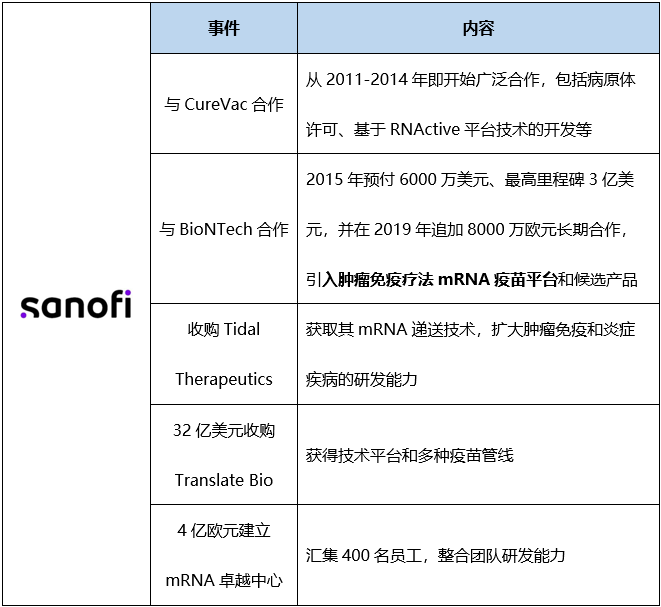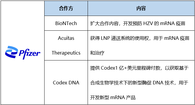表3. 辉瑞和赛诺菲在mRNA技术方面的部分合作