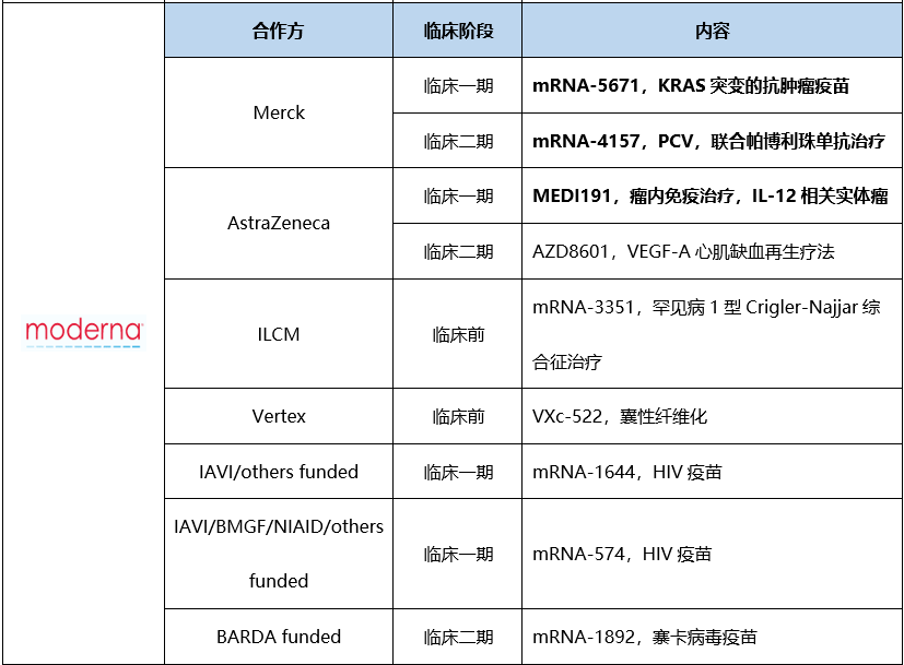 表4. BioNTech,Moderna和CureVac基于mRNA技术产品的研发相关合作信息