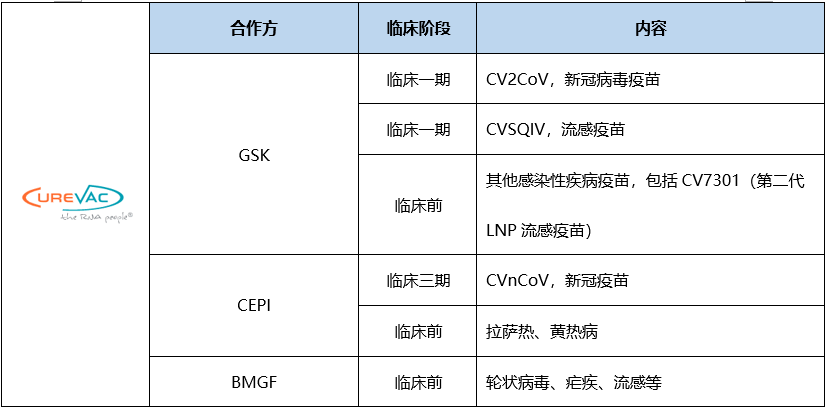 CureVac于2000年在德国成立,在mRNA技术领域深耕20余年,专注于预防疫苗、肿瘤疗法和罕见病等的开发,并与葛兰素史克、勃林格殷格翰、CEPI、CRISPR Therapeutics等合作。