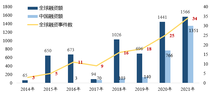 图13. 2014-2021年全球及中国mRNA企业融资趋势(百万美元)[9]