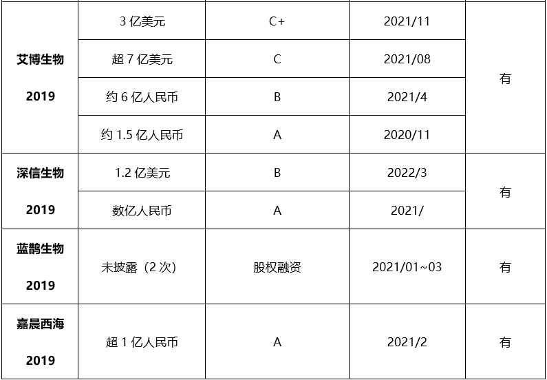 根据《2021年度中国生物医药投融资蓝皮书》(以下简称蓝皮书),2021年中国已披露的总融资额约1187.2亿元人民币,艾博生物、斯微生物、新合生物、深信生物等自2020年以来均获得了2次或2次以上高额投/融资,详见表6。