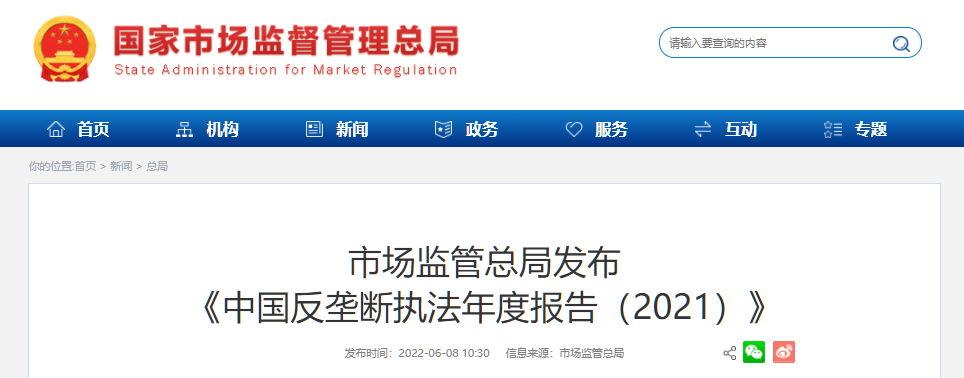 6月8日,国家市场监督管理总局发布《中国反垄断执法年度报告(2021)》,(以下简称《报告》)。《报告》指出,2021年,我国市场公平竞争秩序稳步向好,反垄断和防止资本无序扩张取得重要成效。