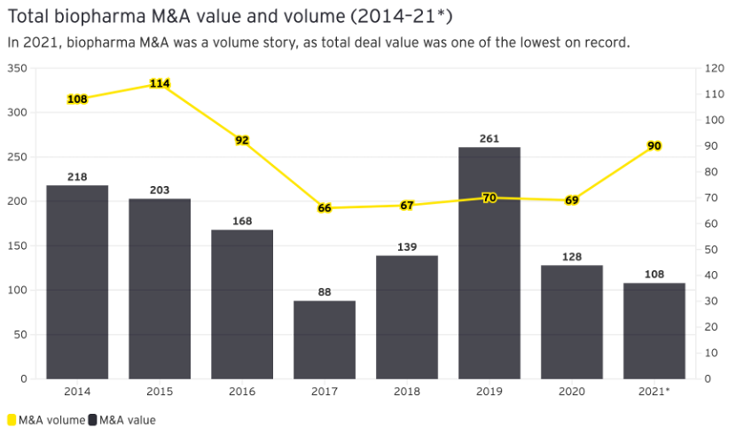 安永的报告指出,去年成交额较2019年的峰值下降60%是因为大药企对大型并购持更加谨慎的态度。加之一些优秀的Biotech公司的出售意愿并不强烈,各方更加倾向于建立战略合作关系。