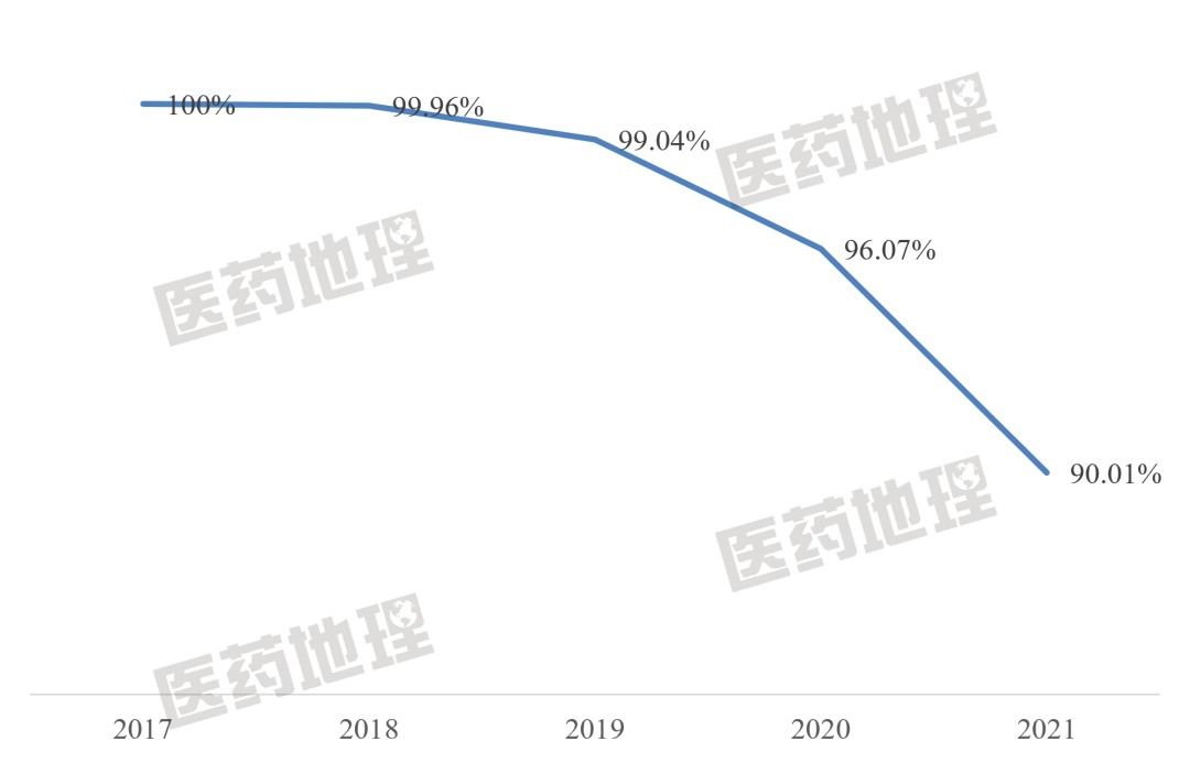 2017年以来,我国Top20创新药品种所占创新药整体市场份额呈下降趋势,其中2021年为90.01%,较2017年下降近10个百分点,说明新增加的创新药正在抢占市场份额。伴随越来越多的新产品上市,未来Top20市场集中度将进一步降低,百家争鸣时代终将到来。