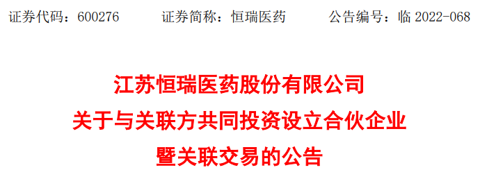 6月6日晚间,恒瑞医药发布关于与关联方共同投资设立合伙企业暨关联交易的公告。