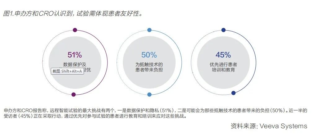 最近,申办方将患者的便利性作为患者参与试验的关键。Veeva的调研结果表明,申办方将数据安全和患者教育视为优化远程智能试验的关键(图1)。我们需要提高患者数据的安全性以及对该安全性的信心,并开发更好的方法来进行试验期间和之后的患者教育和知情同意。
