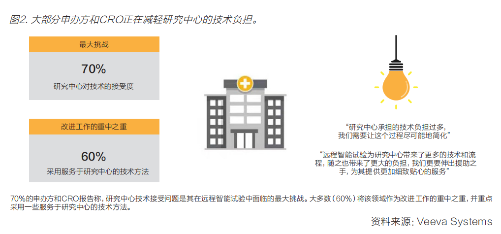 申办方意识到,有必要减轻患者的技术负担,同时,大部分申办方也正在努力减轻研究中心的负担。试验设计变得越来越复杂的情况下,研究中心对试验的开展和患者招募至关重要。但是研究中心对技术接受度问题已成为影响临床试验效率的一大障碍(图2)。