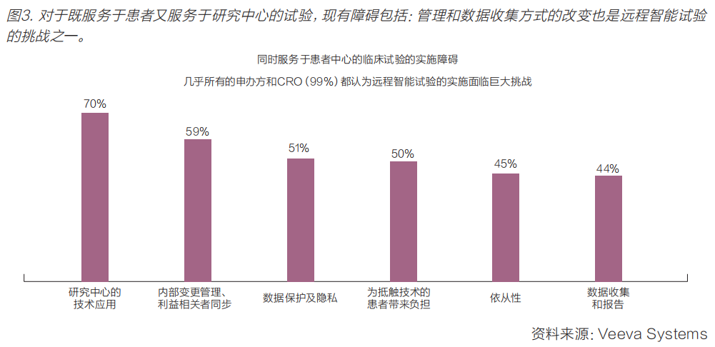 在更基础的层面上,公司还必须解决数字数据优化问题,这是一个无形的后端挑战,我们在进行以患者为中心的讨论时,经常会忽略这个问题。近一半的申办方和CRO指出了数据收集和报告方面的困难(图3)。