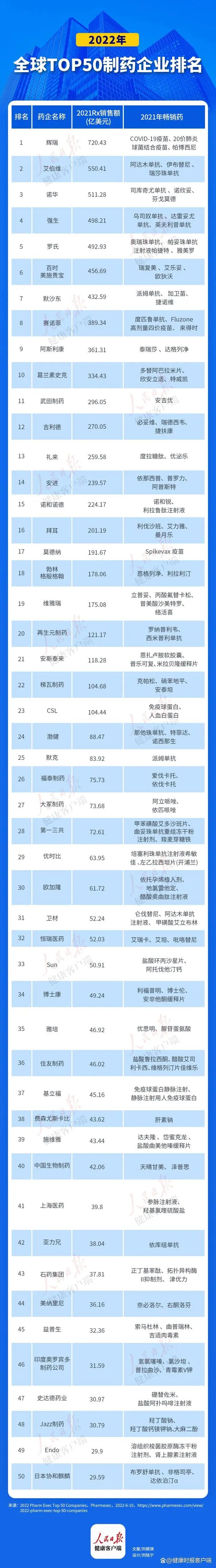 6月10日,美国《制药经理人》杂志(PharmExec)公布了2022年全球制药企业TOP50榜单。PharmExec是国际制药界知名的医药专业杂志,已连续23年公布全球制药企业TOP50榜单。该榜单主要依据各家药企的2021财年处方药销售收入进行排名。