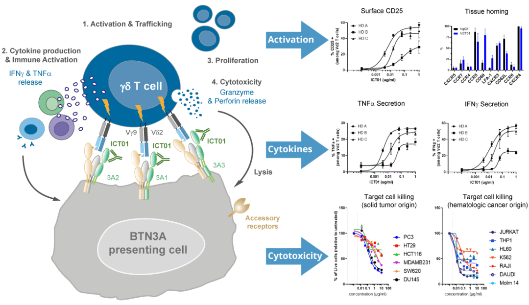 d'Epenoux说,“我们现在已经有三年的临床数据,这引起了相当大的关注。ICT01是一种以BTN3A为靶点的单克隆抗体,其主要作用机制是激活血液循环中的Vγ9Vδ2T细胞,进而对多种肿瘤细胞产生杀伤作用。我们已经证明了它的安全性。”