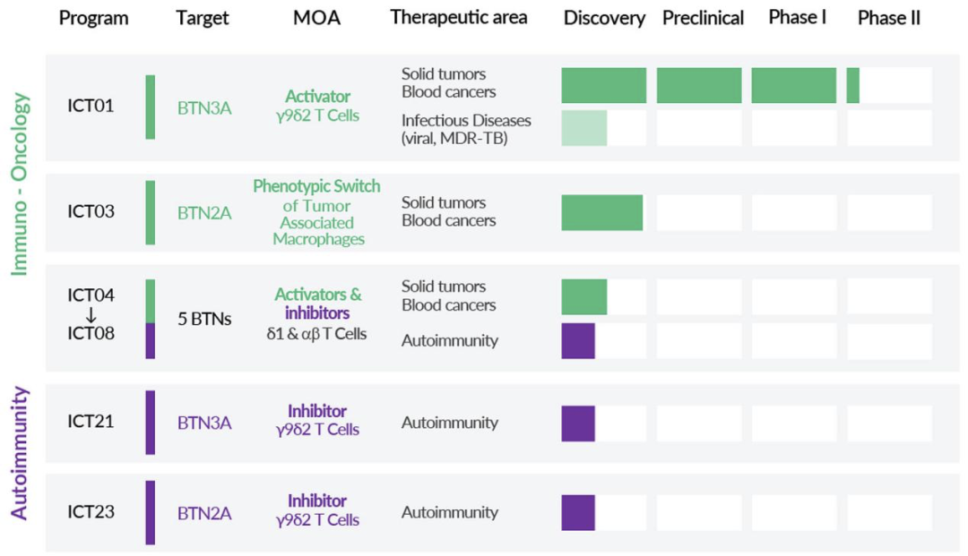 早期临床项目包括靶向BTN/BTNL家族其他成员的治疗性抗体,其设计目的是抑制或激活不同的免疫亚群(其中包括γ9δ2T细胞),它们在免疫肿瘤(IO)和自身免疫性疾病(AID)中都起到重要的作用。随着对 BTN(L) 生物学研究,公司研发了围绕其他免疫细胞群的产品,以创建多样化的 IO产品。
