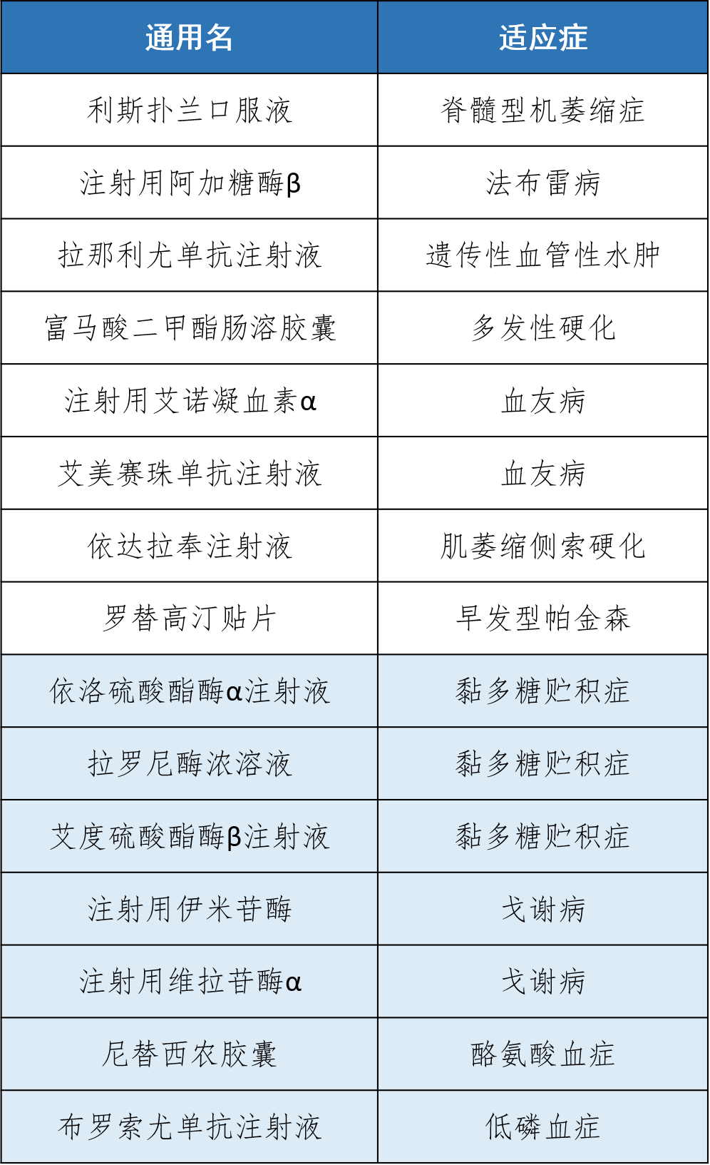 备注:颜色表注部分为国家医保目录无药品纳入的病重