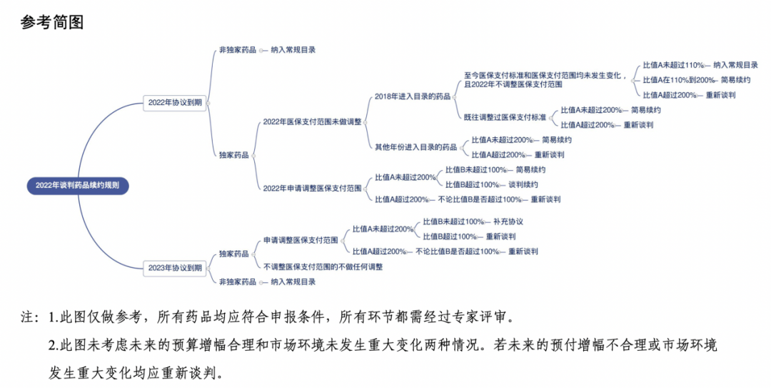 此次调整方案的第二个亮点在于国家医保局公布了《谈判药品续约规则(征求意见稿)》,主要对常规目录、简易续约和重新谈判等三大规则进行了详细的解释说明。一、纳入常规目录管理:对于非独家产品及2018年谈判进入目录且连续两个协议周期均未调整支付标准和支付范围的独家药品,可以纳入常规目录管理。二、简易续约:对于独家产品、且协议期医保基金实际支出未超过预估值200%、且预计未来的预算增幅合理的产品,进行简易续约,根据实际支出超过预估值的比例进行梯度价格调整。三、重新谈判:对于医保基金实际支出与预算影响预估值比值大于200%的药品,无论是否申请调整医保支付范围,均进行重新谈判。