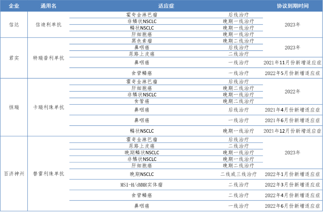 以市场热度最大的PD-1单抗为例进行分析,除了面临首次谈判的赛帕利单抗、派安普利单抗、斯鲁利单抗之外,面临续约谈判的主要为已经纳入医保的4个品种。其中信迪利单抗为2023年协议到期且支付范围无需调整,故不在此次续约谈判的范围内。君实的特瑞普利单抗为2023年协议到期,目前有两个适应症未纳入医保。由于之前上市的三个适应症均为二线治疗或后线治疗,覆盖患者人群较少,在PD-1本身市场竞争激烈的情况下笔者推测目前比值A未超过200%,但是需要纳入的两个适应症均为一线治疗,患者人群大,如果将其纳入医保支付范围那么预算增加值会显著提升,推测比值B会大于100%导致重新谈判。恒瑞的卡瑞利珠单抗为2022年协议到期,目前有3个适应症未纳入医保,其中鼻咽癌的两个适应症上市时间符合2021医保谈判的要求但是未能纳入,据此推测是由于卡瑞利珠单抗在进入医保后销量增长明显,导致调整支付范围需要重新谈判但未能谈判成功。此次在去年的基础上又增加了一个大适应症,重新谈判已经难以避免。百济神州的替雷利珠单抗为2023年协议到期,需要调整支付范围纳入的适应症达到4个,因此预算增加值会显著提高,推测比值B会超过100%,因此无论比值A是否超过200%,均会面临重新谈判。