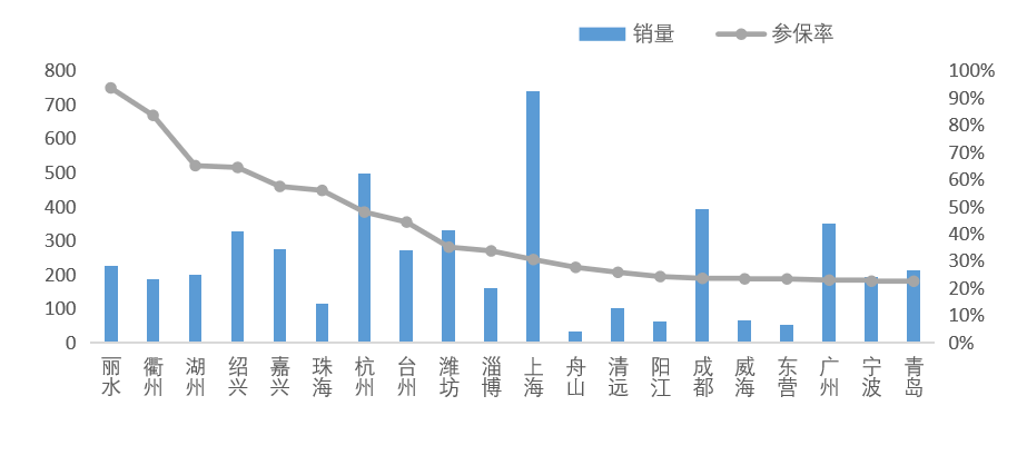 其中,覆盖城市迅速扩展、参保比例逐年提升是最显著的变化。数据显示,浙江、江苏、山东、广东和四川五省的产品销量都在千万量级以上。如果从城市维度来看,经济发达地区以及直辖市的参与程度更高,参保人数也相对更多,比如上海、杭州、广州等。在产品数量增多的同时,参保率也有了明显提高。据统计,2021年上市的项目参保率为9.1%,比2020年的4.2%提高了一倍多,这也意味着惠民保在数量增长的同时也实现了质量的阶梯式跨越。