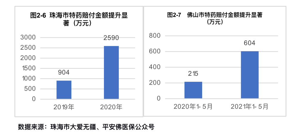 根据公开数据显示,珠海“⼤爱⽆疆”的特药 2020年赔付金额相较前年增⻓ 186.5%;珠海市患者使⽤免疫疗法的比例比周边城市⾼出 5-6倍;平安佛⼭保特药赔付金额则较前⼀年同期增长 180.9%。这与医保准入后药物的放量类似,在经过⼀年惠⺠保“ 市场教育”后,药企、医⽣、患者相继参与,直接或者间接促进了药品使用的提升,以及医疗成本的增加。