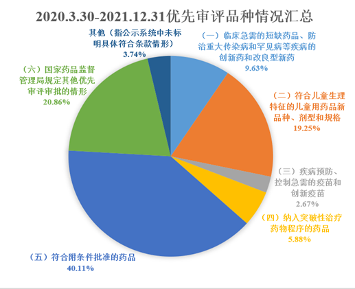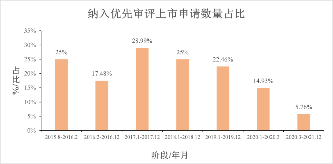 2020年3月至2021年12月底,纳入优先审评审批的注册申请占总上市申请的数量降低到约5.76%,这是优先审评审批门槛提高的直观表现。