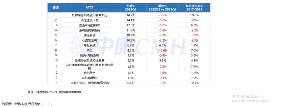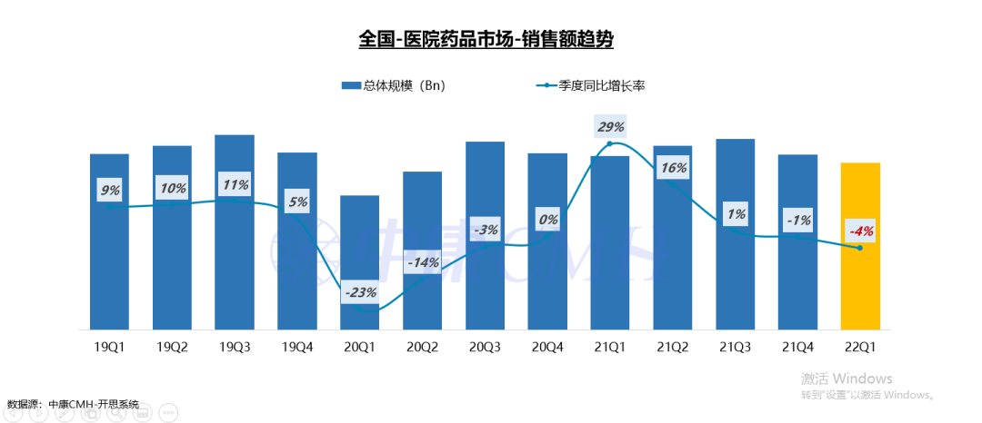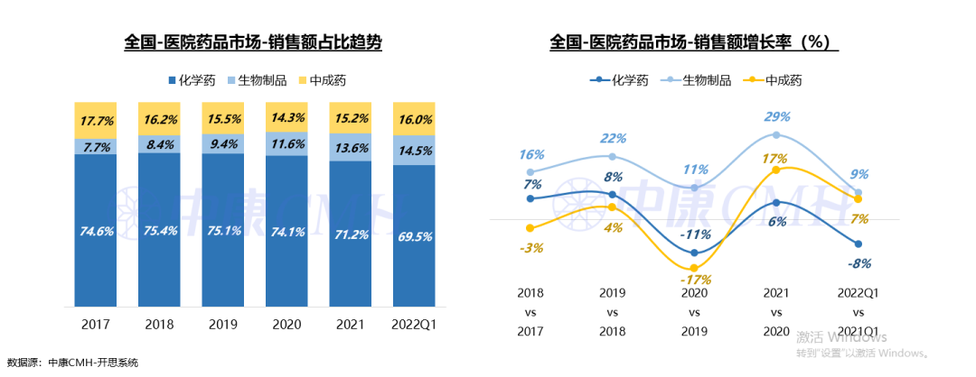 2022Q1中国医院药品市场销售额总数达2290亿,同比下降4% ,近两季度医院市场规模呈现下滑,可能原因是2021年有较高的基数,并且Q1也有零星疫情影响。02 化药生物药中成药数据表现