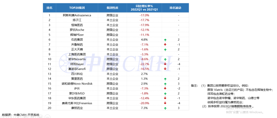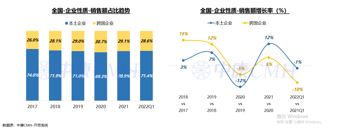 化学药在医院市场的份额占比逐年下降,2022Q1跌破70%;生物制品在2020年份额有较大的提升,且持续保持扩容趋势。2022Q1化学药销售额为1580亿,同比下降8%;生物制品和中成药均保持正向增长,增长率分别为9%和7%。按照分类来说,集采品种主要是化药,化药的占比在稳定下降,其中份额被中成药及生物药给占据,生物药占比提升主要是因为近几年获批的新药大多数是生物药,医保谈判帮助这些获批的生物药快速放量,因此生物药占比稳定提升。03 本土企业VS跨国企业