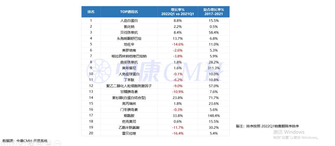 从通用名维度来看,人血白蛋白位列第一,2022Q1同比增长8.8%,5年复合增长率为15.5%。氯化钠、贝伐珠单抗分别排名第二、第三位,销售额同比上涨,分别为2.2%、8.4%。TOP20通用名中,紫杉醇(白蛋白结合型)、烟酰胺均呈现快速增长态势。贝伐珠单抗一方面受益于适应症的不断增加,另一方面也受益于跟其他药品的联用,最后是新的玩家不断涌入,除了罗氏以外,齐鲁、信达、绿叶等新玩家也加入战场,多方面原因让贝伐珠单抗迅速放量,然而布局贝伐珠单抗的企业较多,在排队的企业仍然超过5家,在越来越多的新玩家助推下,预计贝伐珠单抗市场仍然会保持较高的增速。