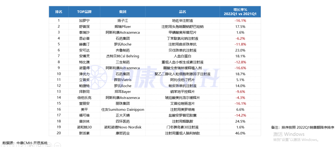 2022Q1大部分企业销售额同比均下滑,阿斯利康、扬子江、恒瑞医药、罗氏、辉瑞稳居集团排名前五,一季度同比下降超10%。石药集团、复星医药、诺和诺德、康哲药业实现规模排名双提升,四川科伦同样保持正增长。TOP20企业中,跨国企业仅诺和诺德实现规模上涨。TOP20企业中大部分都是增速下降,这主要是因为老牌企业中大部分都有比较多的仿制药或原研药,在集采常规化的进行中,仿制药或原研药销售额不断下降。04 品类及产品表现