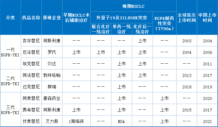 目前,我国市场上自2005年已陆续上市第1、2、3代EGFR抑制剂:厄洛替尼、吉非替尼、埃克替尼、阿法替尼、达克替尼、奥希替尼、阿美替尼、伏美替尼。