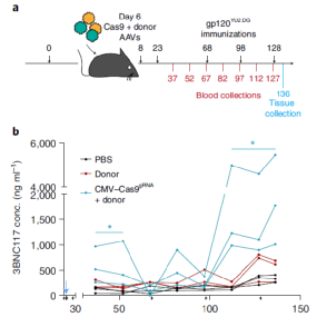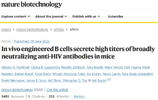 2022年6月9日,来自特拉维夫大学的Adi Barze团队在Nature biotechnology上发表了题为In vivo engineered B cells secrete high titers of broadly neutralizing anti-HIV antibodies in mice的研究性论文,称找到了一种新的、独特的艾滋病治疗方法,即使用两种腺相关病毒载体对体内B细胞进行了改造,一种编码金黄色葡萄球菌Cas9 (saCas9),另一种编码3BNC117,一种抗HIV bNAb,将载体静脉注射到小鼠体内后,可产生高滴度的抗HIV广泛中和抗体(bNAb)。