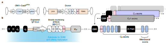 首先,研究人员对体内B细胞进行了改造,使用了两种腺相关病毒载体(AAV-DJ vectors),一种编码金黄色葡萄球菌Cas9 (saCas9),另一种编码3BNC117,一种抗HIV bNAb。在第一组实验中,saCas9由CMV启动子表达,单向导RNA靶向saCas9至免疫球蛋白重基因座(IgH)。反过来,bNAb在IgH增强子依赖性启动子的控制下被编码为双顺反子盒,并在IgH基因座的 J-C内含子内与所需的saCas9切割位点同源臂两侧。bNAb盒包括完整的轻链和重链的可变区段(VH)。剪接供体序列跟随VH基因片段,以使其与恒定IgH外显子融合,整合到基因座中并随后进行转录和剪接。这种设计有助于破坏内源性IgH 基因座和作为膜BCR的初始 bNAb 表达,随后在抗原结合上激活工程化B细胞,从而导致分化为记忆细胞和浆细胞。