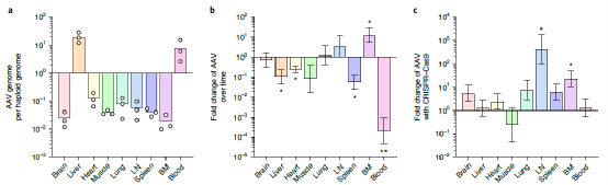 为了评估体内工程方法可能的脱靶效应,首先在各种组织中,量化了中和抗体基因的拷贝数。在第37天,在肝脏中发现中和抗体基因具有高拷贝数,并且在第136天水平仅降低了10倍。从第37天到第136天,骨髓中的AAV拷贝数显著增加,并且在淋巴结中也检测到了不显著的相似趋势,表明这些组织中可能积累了3BNC117表达细胞。然后,研究者使用来自治疗小鼠和阴性对照小鼠的肝脏和脾脏的gDNA,对四个潜在的脱靶位点、以及在靶位点进行了靶向测序。相对于来自未经治疗小鼠脾脏的对照DNA突变率较高的趋势,表明在肝脏而不是脾脏中,CRISPR-Cas9诱导的双链DNA断裂修复容易出错,而且只在IgH上的靶点,而不是在任何其他检测的脱靶位点。这说明CRISPR–Cas9脱靶切割率极低,而通过从B细胞特异性启动子表达saCas9减少了其它组织中靶向切割的产生。