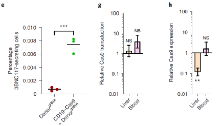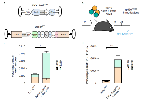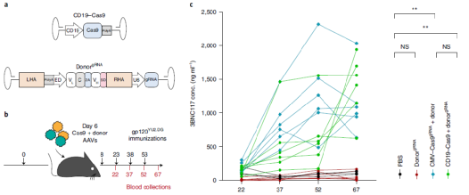 为了进一步提高本方法的安全性,研究者在B细胞特异性启动子CD19的控制下对saCas9进行编码。即用20 μg HIV gp120免疫C57BL/6小鼠,6天后每只小鼠与一个编码saCas9的载体共同注射,由CD19启动子、以及编码bNAb和sgRNA 的第二个载体调控。随后小鼠接受了多达六次额外的免疫接种。在四次免疫接种后,接受治疗的小鼠血液中已含有高达2 μg ml-1的3BNC117中和抗体。第四次免疫后45天,使用 ELISPOT可以在骨髓中检测到相似的3BNC117分泌细胞率。