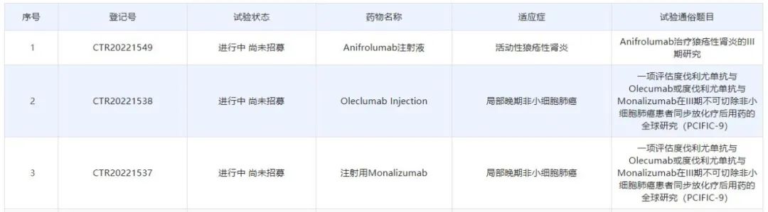 6月20日,中国药物临床试验登记与信息公示平台显示,阿斯利康(AstraZeneca)有三款抗体新药在中国启动了3期临床试验,分别为抗CD73抗体oleclumab、抗NKG2A抗体monalizumab、靶向I型干扰素受体的抗体新药anifrolumab,涉及的适应症包括特定非小细胞肺癌、活动性狼疮性肾炎成人患者。