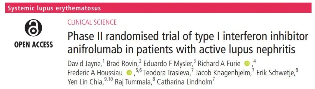 2022年2月,研究人员公布了anifrolumab治疗活动性狼疮性肾炎的2期临床数据。在该研究中,147例患者被随机分组(1:1:1)接受anifrolumab基本方案、anifrolumab强化方案或安慰剂治疗。