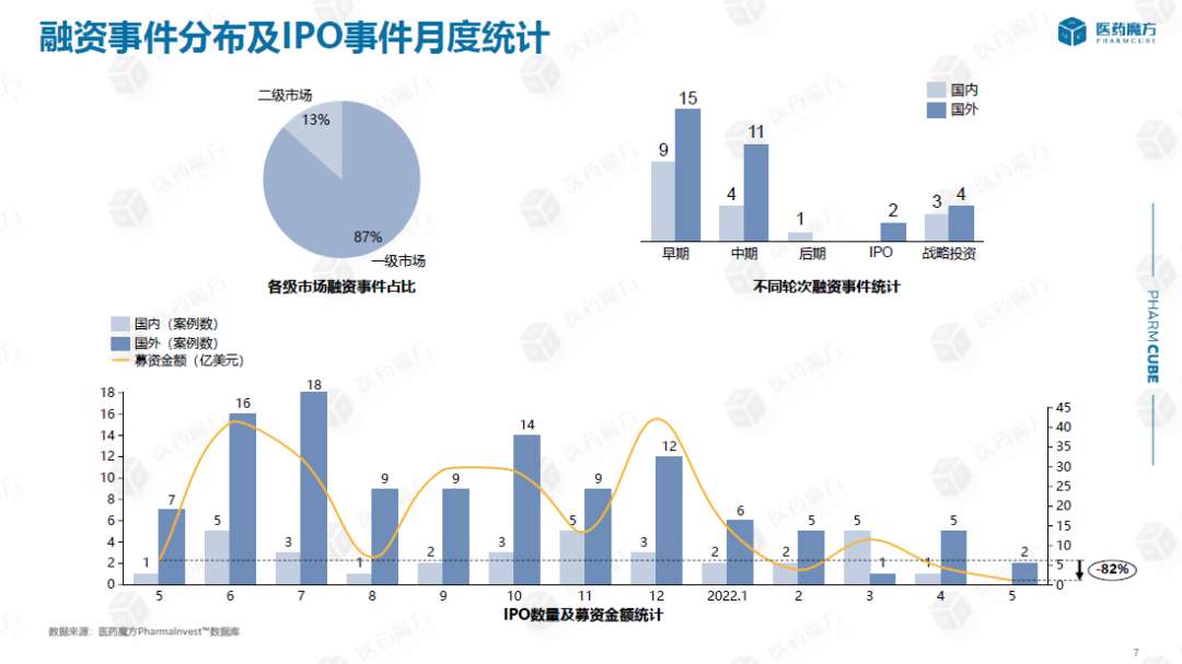 此模块魔方投融资数据团队会统计每月全球创新药领域投融资事件数及融资总额、创新药企业IPO信息、各技术赛道融资情况、国内投融资事件地区分布等数据,通过对创新药领域投资规模及趋势、IPO事件、技术赛道分布等多个维度数据的定期跟踪,帮助大家从宏观维度了解和把握全球创新药领域投融资概况与表现。