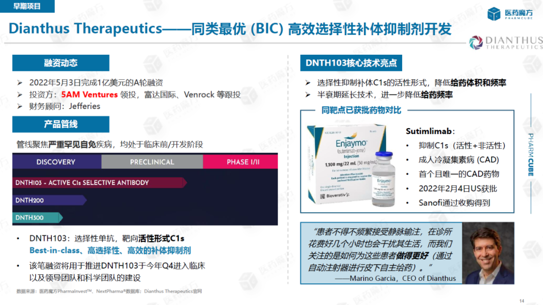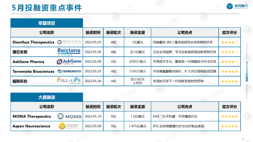 此模块医药魔方投融资数据团队会通过PharmaInvestTM数据库在每月分别筛选出“早期项目”和“大额融资”两类投融资重点事件,对这些获得早期及高额融资的事件进行及时跟踪,并从投资机构、技术特色、团队背景、竞争格局等方面进行多维度分析,挖掘项目背后的投资亮点,旨在助力行业内客户及时把握创新药领域最新的投融资动态,挖掘优质项目,发现研发与投资的新机会。