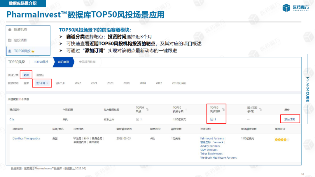 PharmaInvestTM为医药魔方自主研发的医药投融资数据库产品。本数据库致力于为医药企业的情报部门以及专注于医药投资领域的投资人提供便捷高效的全球创新药投融资数据的查询工具。数据库将创新药研发企业的融资数据、企业研发管线、在研靶点、核心技术等企业核心资产数据与投资机构信息进行整合穿透,并结合算法模型,帮助用户快速准确得查询到目标数据。当前收录全球创新药企业近万家,并与医药魔方NextPharma®、InvestNewsTM数据库形成了良好的数据生态。