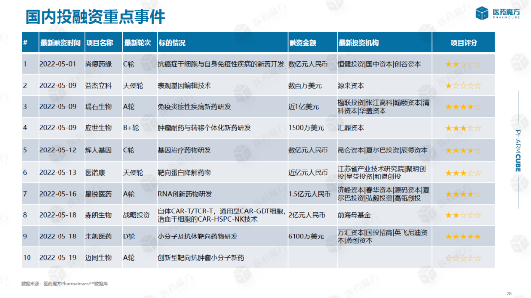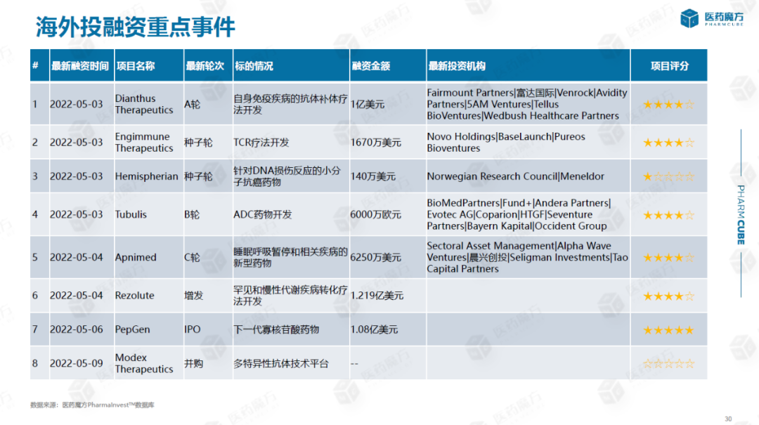 此模块魔方投融资数据团队整理了上月国内外创新药领域的所有投融资事件及其标的情况。团队旨在通过对行业数据的收集汇总,帮助客户不遗漏重要的创新药投融资情报数据,并基于此数据进行分析,更好地赋能工作。