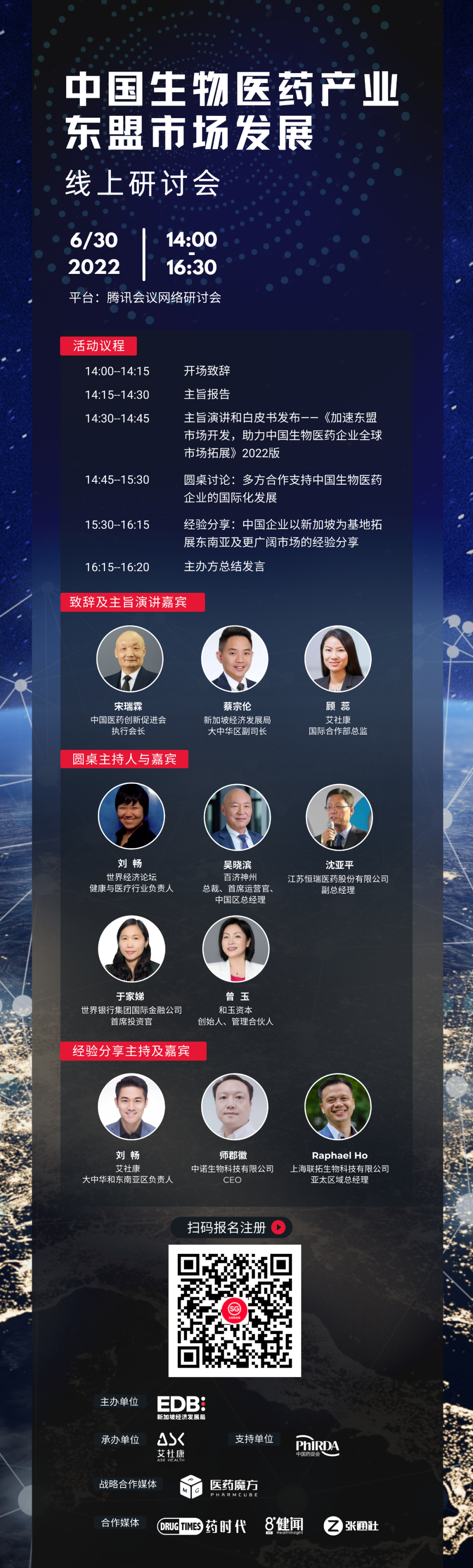 为增进中国生物医药企业对东盟制药生态的了解,助力企业拓展东盟及更广阔市场,新加坡经济发展局(EDB)将于2022年6月30日(周四)下午在线上举办“中国生物医药产业东盟市场发展研讨会”,中国医药创新促进会作为本次会议支持单位,宋瑞霖执行会长将作主旨报告。