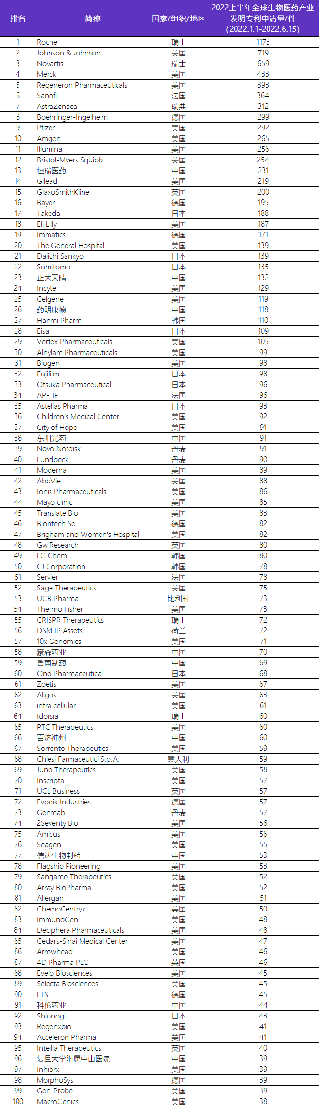 2022上半年全球生物医药产业发明专利排行榜(前100名)
