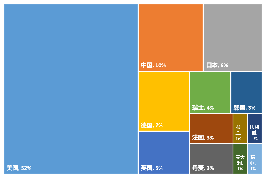 入榜前 100 名企业/医院主要来自 13 个国家、组织或地区,美国占比 52%,其次为中国占比 10%,日本占比 9%;德国占比 7%、英国占比 5%、瑞士占比 4%;韩国、法国和丹麦分别占比 3%;荷兰、比利时、意大利和瑞典各占比 1%。