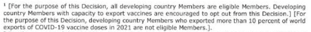 脚注1第一个方括号将所有发展中国家成员都界定为合格成员,但鼓励有能力出口疫苗的发展中国家成员选择不使用这一决议提供的灵活性。