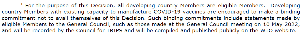 决议脚注1明确:所有发展中国家成员都是“合格成员”。鼓励现有生产新冠疫苗能力的发展中国家成员作出有约束力的承诺不利用这一决议。此类具有约束力的承诺包括合格成员向总理事会所作的声明,如2022年年5月10日在总理事会会议上所作的声明,并将由TRIPS理事会记录,并将在WTO网站上汇编和公开发布。