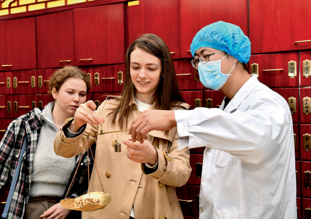 ▲ 2021年4月23日,在青岛西海岸新区中医医院国际学生中医药文化体验基地,来自中国石油大学(华东)的留学生在药房医师的指导下对药材进行称重 郭绪雷摄/瞭望