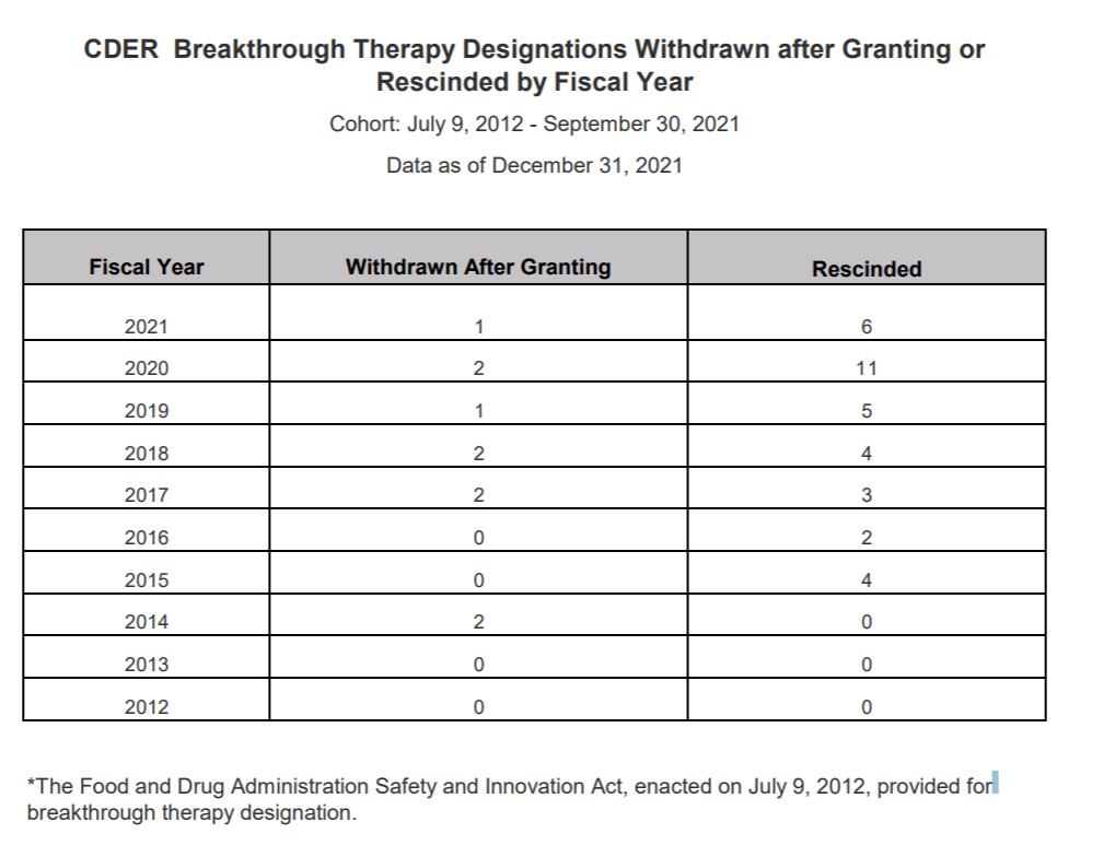 在设立突破性疗认定最初的几年里,没有产品被撤销认定,随后FDA开始给这个“补丁”打“补丁”。