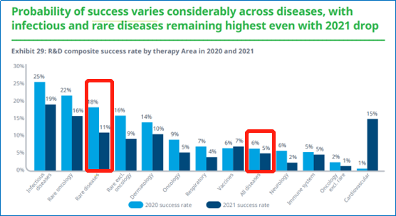 ▲图 2 各治疗领域2020、2021年研发成功率 资料来源:Global Trends in R&D OVERVIEW THROUGH 2021,IQVIA