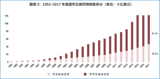 也正是基于罕见病孤儿药的医学价值,药物取得孤儿药身份或索性以孤儿药身份上市,并逐渐扩展多个罕见病或非罕见病适应症,以获取更丰厚的市场回报。根据IQVIA对美国1992-2017年间孤儿药销售情况的分析,非罕见病适应症为药物整体销量所作出的贡献明显高于罕见病适应症所带来的销量。