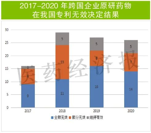 数据也印证了这一判断。国家知识产权局的专利无效宣告决定初步检索发现,2020年国家知识产权局公布的无效宣告决定号数量为26件,与此前两年(2018-2019)基本持平(分别为29件和27件),在近两年(2019-2020)的无效宣告决定中,全部无效决定都超过半数(分别为59%和54%)。